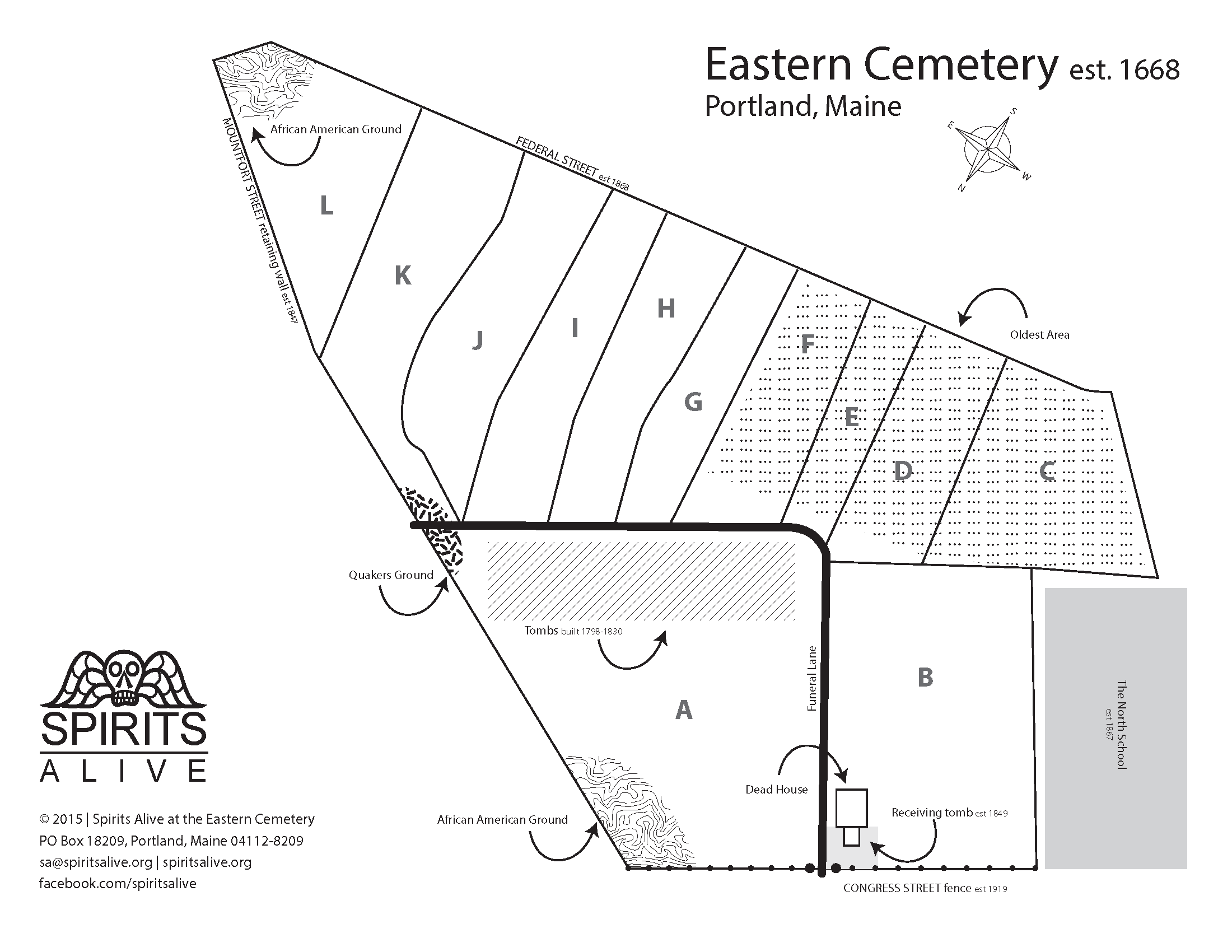2015 Visitor Map of Eastern Cemetery: Section letters were assigned during a survey in the 1890s. The oldest graves are found in D (the waterfront side of the cemetery). Sections A and B were added in 1795.