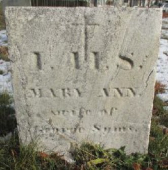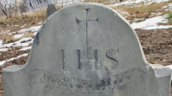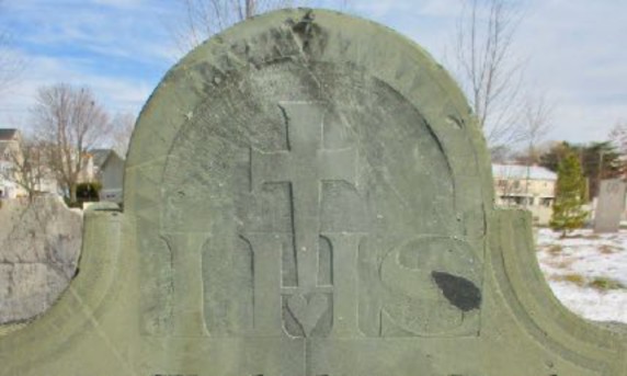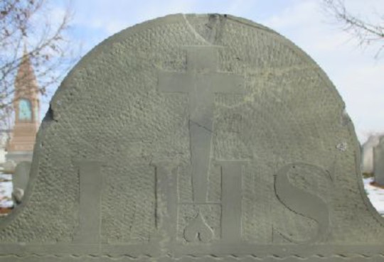 The only other known Bartlett Adams marker featuring a Holy Cross is also located at Eastern Cemetery. It’s for James Davis (Figure 5), who died in 1810 at age 46. While Jordan indicates Mr. Davis’ stone has been lost, I found it very close by the Gannen stone. It’s a slate which features a simple Holy Cross and letters "I. H. S." This is Latin for "Iesus hominum Salvator," or "Jesus, the savior of humankind." In slang, it’s referred to as "In His Service." Under this design, we find a banner with the Latin "Memento Mori" (for "remember death" or "remember we must die.") Bartlett Adams knew Latin and used it on a good number of markers, including three at Eastern Cemetery that he carved for his own infant children.